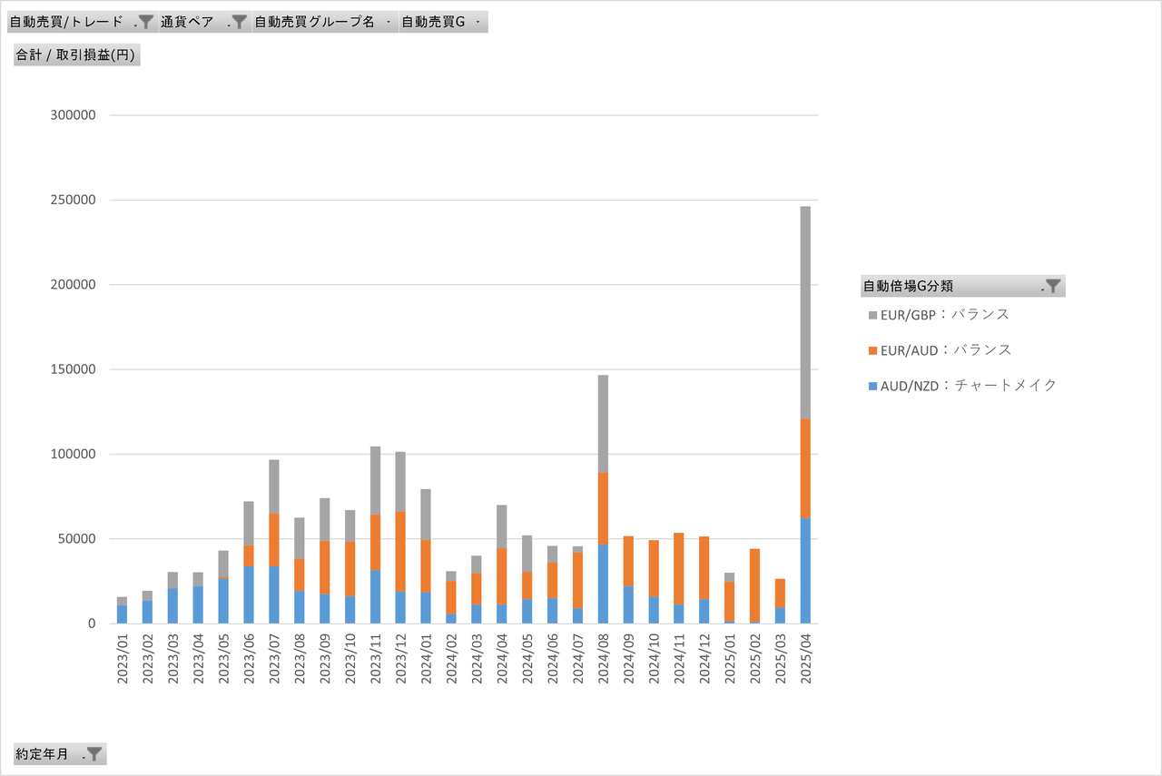 2025年4月は相変わらずEURAUDが両建てレンジを外れたものの、全体にボラティリティの高い展開で、利益を積み上げてくれています。
