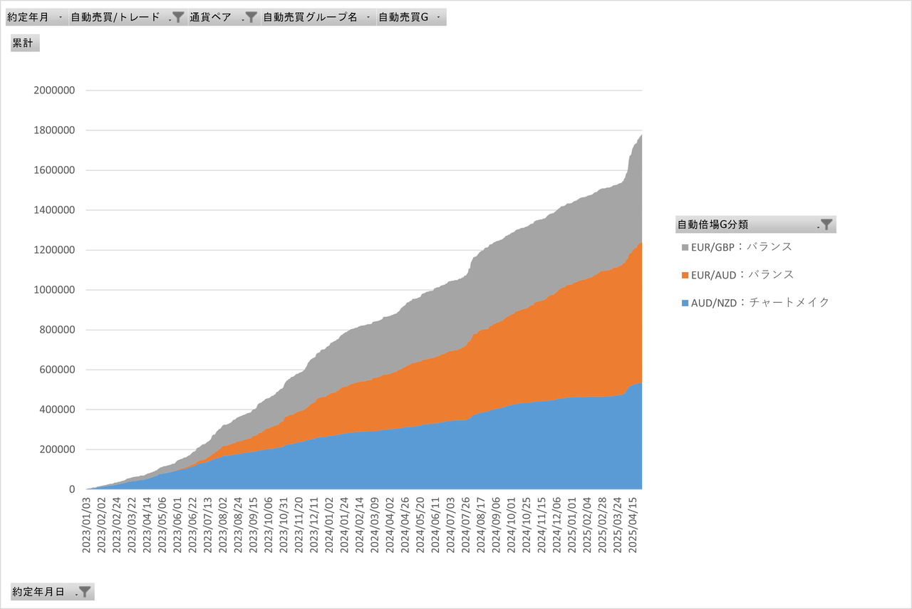 画像は2023年1月から現在までの各自動売買グループの合算の累積グラフです。