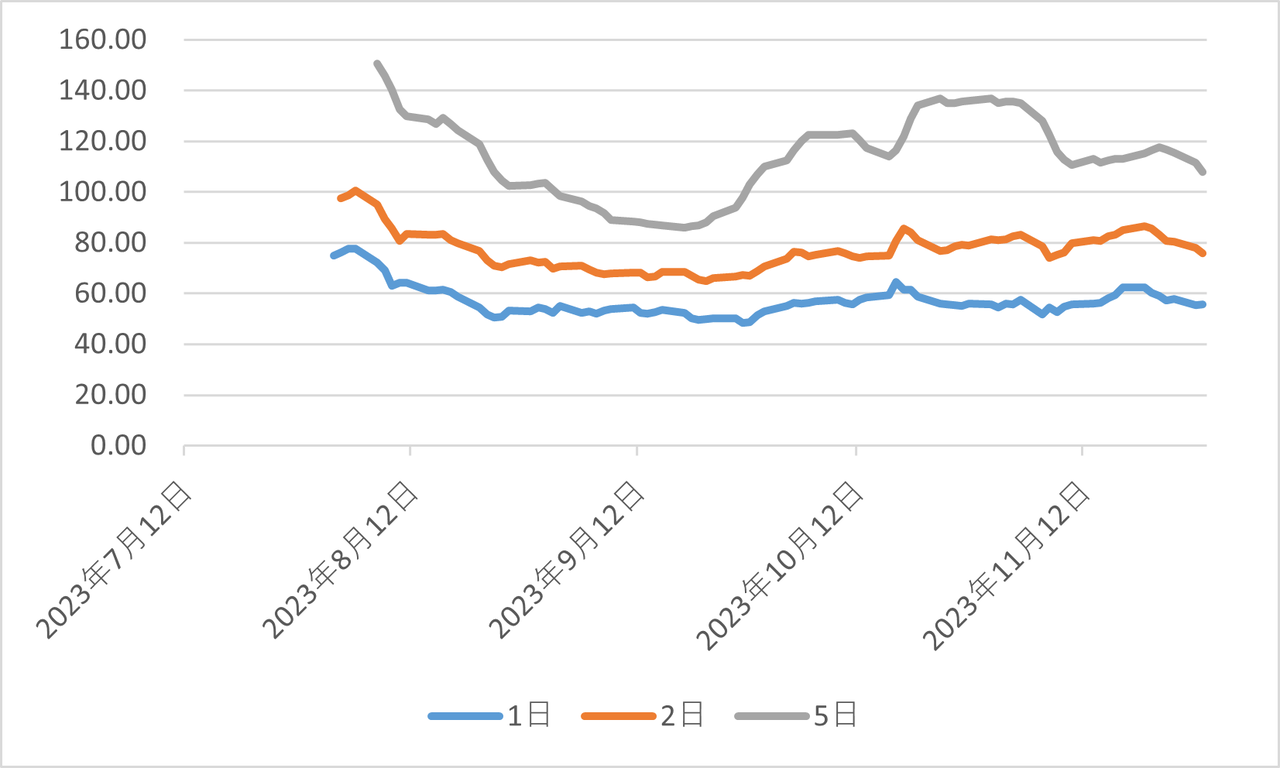 1日の間には概ね60pips程度動く、2日間では80pips、5日間では100~120pips前後動くことが読み取れます。