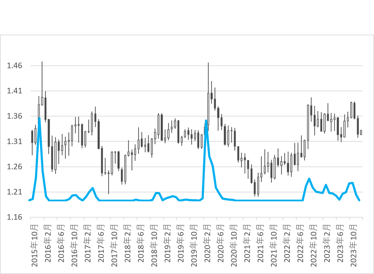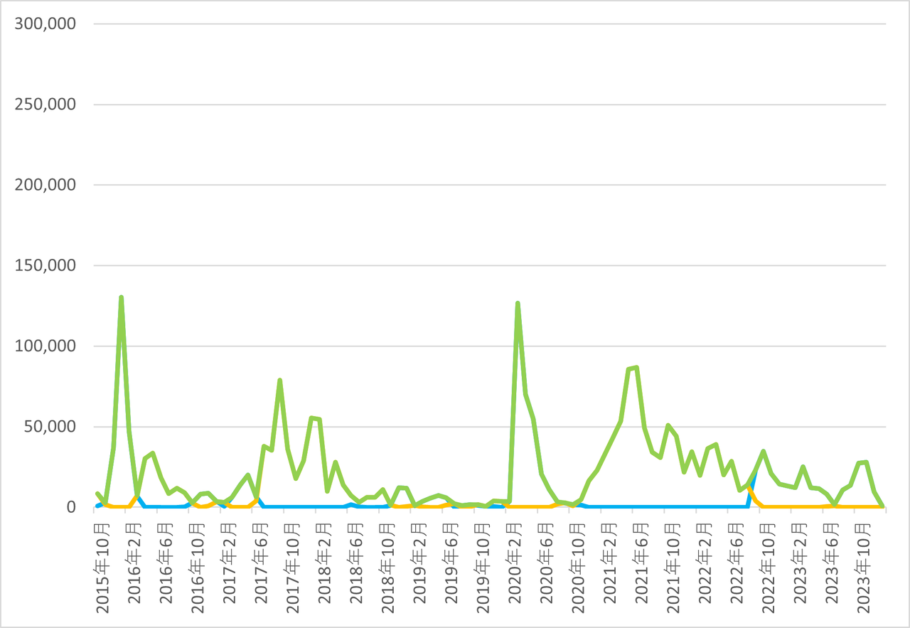 表をグラフ化したものが以下です。グラフでは2015年10月から2023年12月までを含みます。