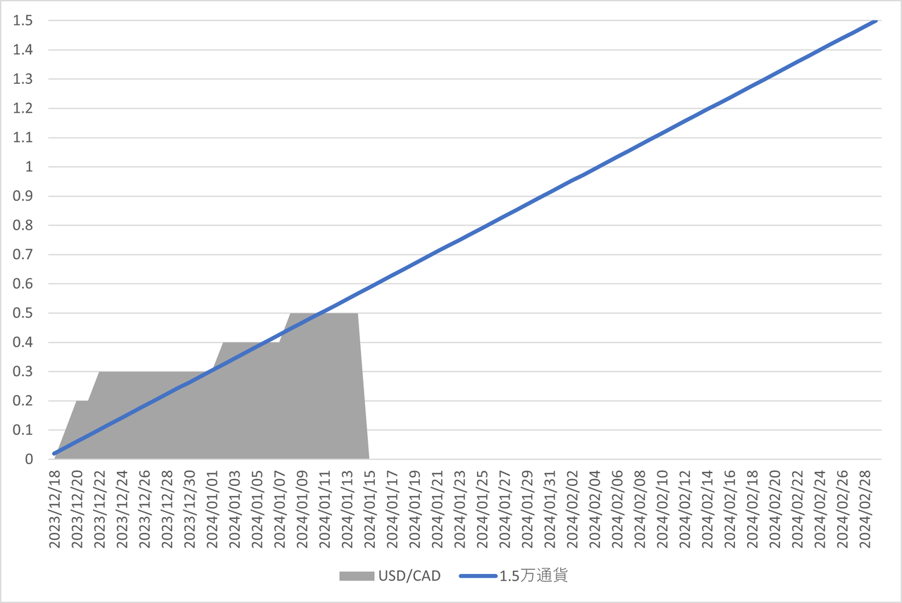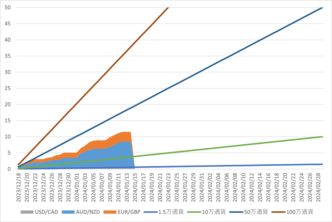 上図は、2024/1/12の取引終了時点での2/29までのblogminihomerの各通貨の新規取引数量(面グラフ)と、2/29に条件達成すると仮定した場合をイメージした直線(折れ線グラフ)です。