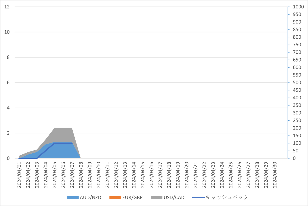 上図は、USD/CAD、AUD/NZD、EUR/GBP各通貨の新規取引数量(面グラフ)と、キャッシュバック想定金額(折れ線グラフ)を表したグラフです。