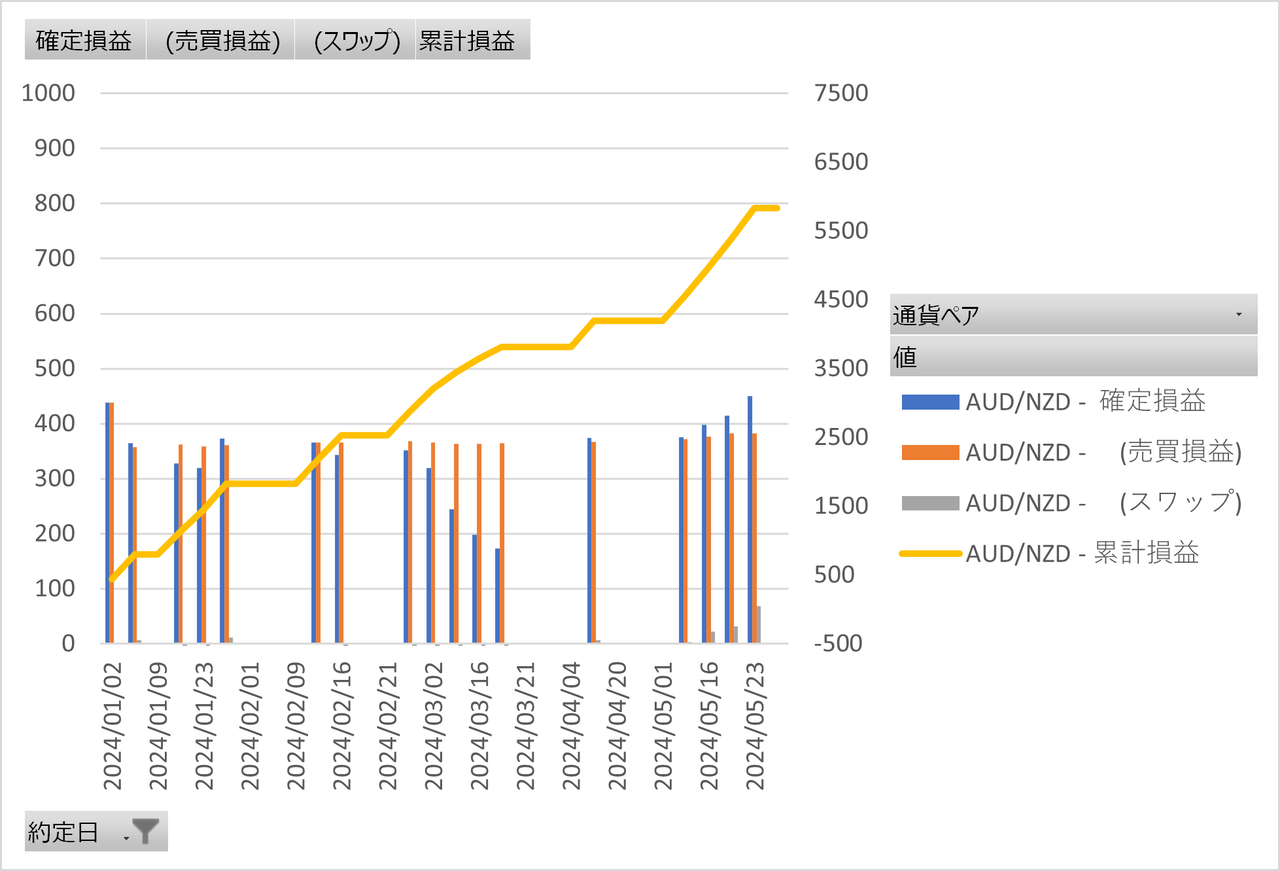 上下動を繰り返さず、上方向(豪ドル高NZドル安)に上がり続ける一方だと、評価損益だけがどんどん大きくなっていきます。