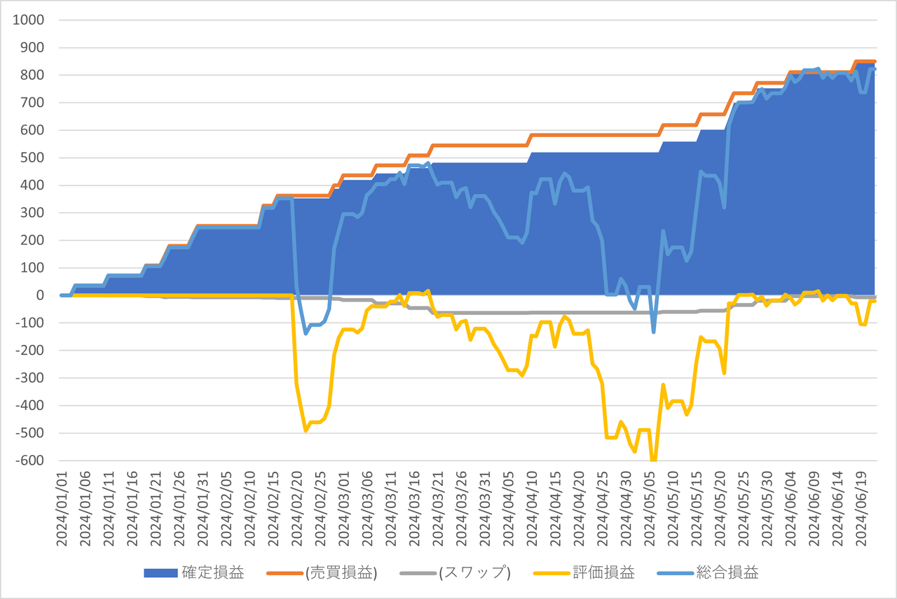 確定損益と内数としてスワップポイント、確定損益(面グラフ)に加えて評価損益(黄色ライン)と総合損益(確定損益+評価損益)(水色ライン)を表示してます。