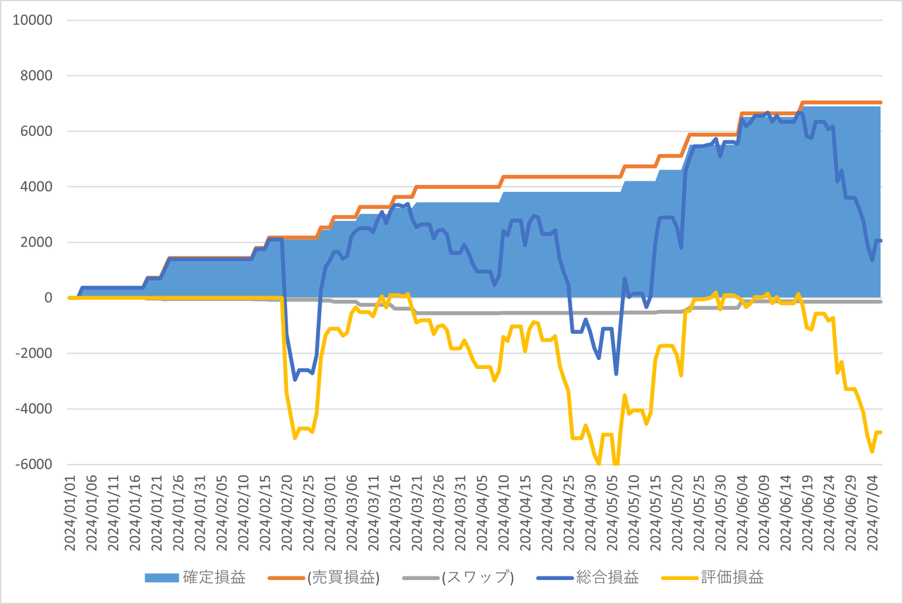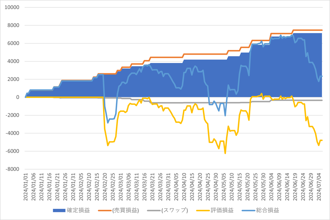 確定損益と内数としてスワップポイント、確定損益(面グラフ)に加えて評価損益(黄色ライン)と総合損益(確定損益+評価損益)(水色ライン)を表示してます。