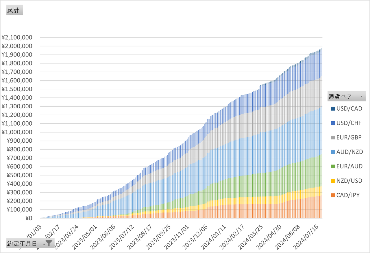 次に2023年1月からの日次で積みあがっていく利益の推移を公開します。*2023年11月に利確総額100万円を超え、2024年3月に150万円を超えました!