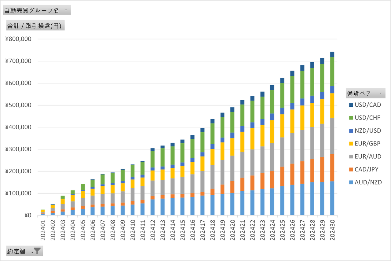 2024年の利益の推移を週次グラフで見ていきましょう約定していったログからグラフ化してますので、実際の取引状況を感じて頂けるかと思います。
