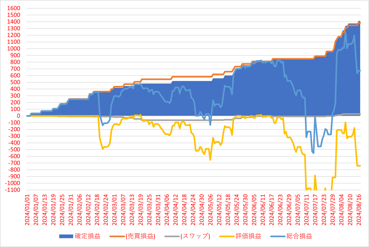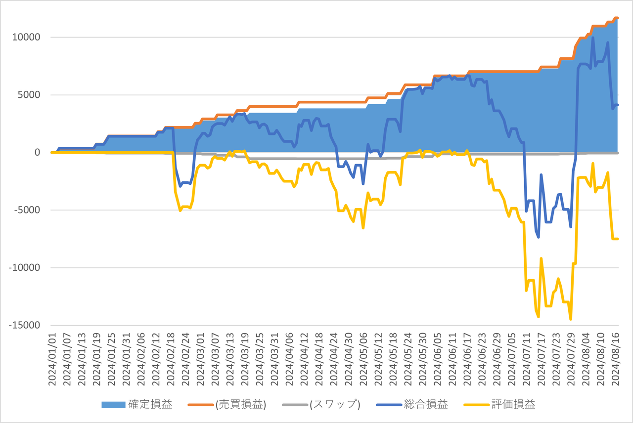 確定損益と内数としてスワップポイント、確定損益(面グラフ)に加えて評価損益(黄色ライン)と総合損益(確定損益+評価損益)(水色ライン)を表示してます。