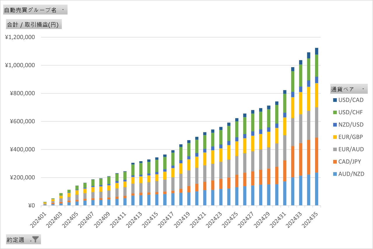 私の自動売買注文グループの注文数のバランスから、AUD/NZDが下振れ(上振れも同様)すると、評価損失(含み損)が大きくなります。今週も先週に引き続きダイナミックな値動きで、利益を積み上げてくれました。