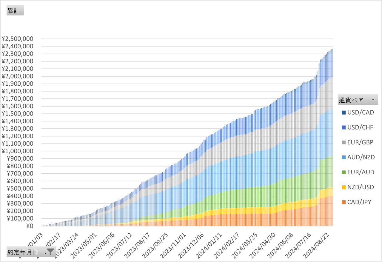 次に2023年1月からの日次で積みあがっていく利益の推移を公開します。*2023年11月に利確総額100万円を超え、2024年3月に150万円を超えました!