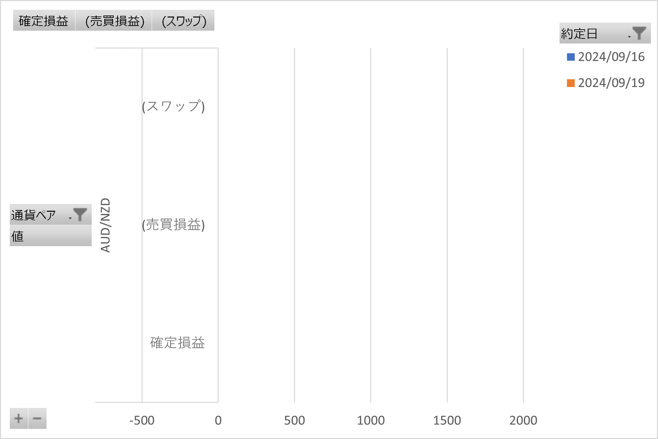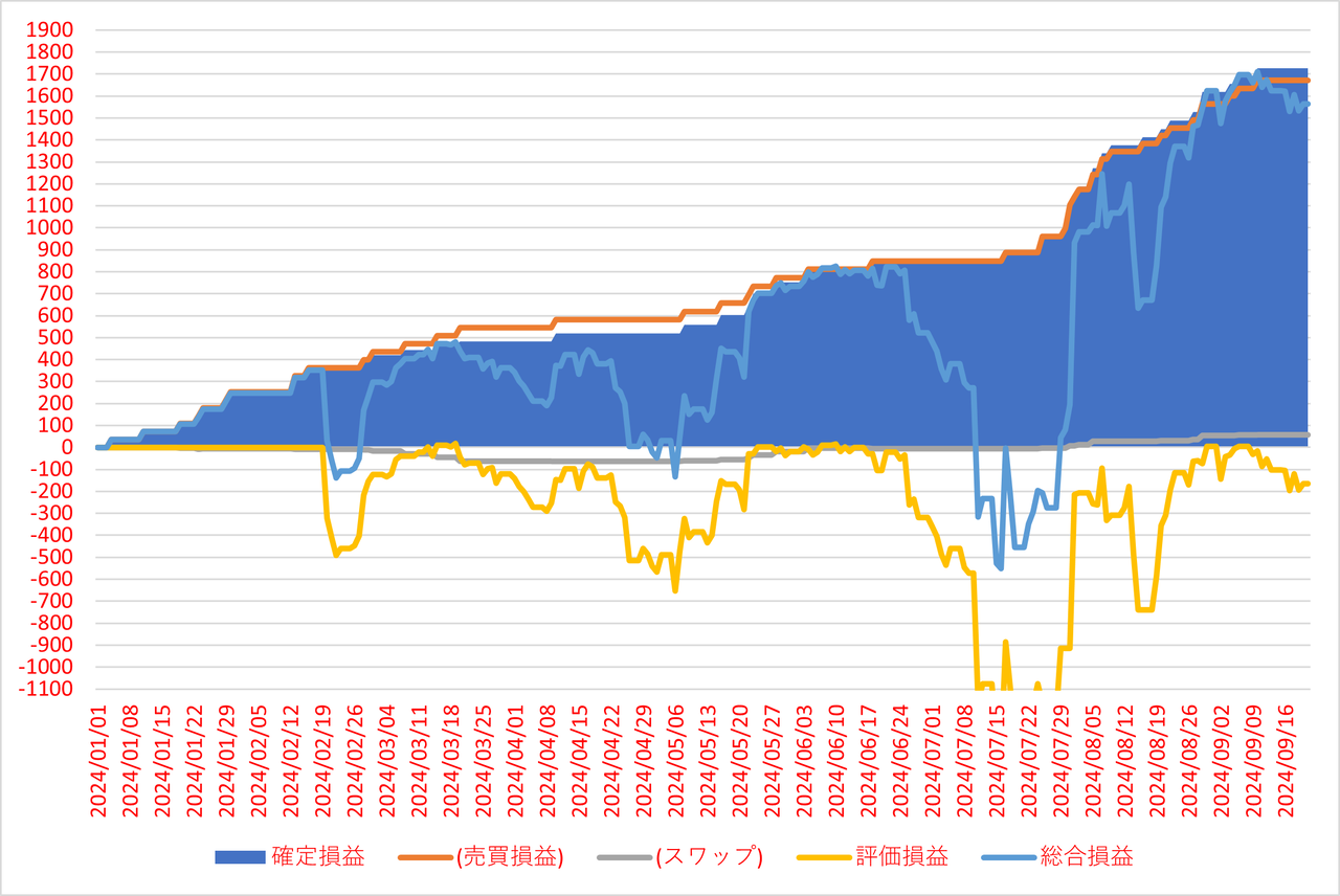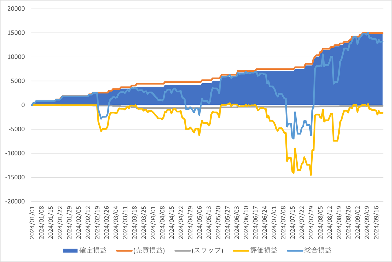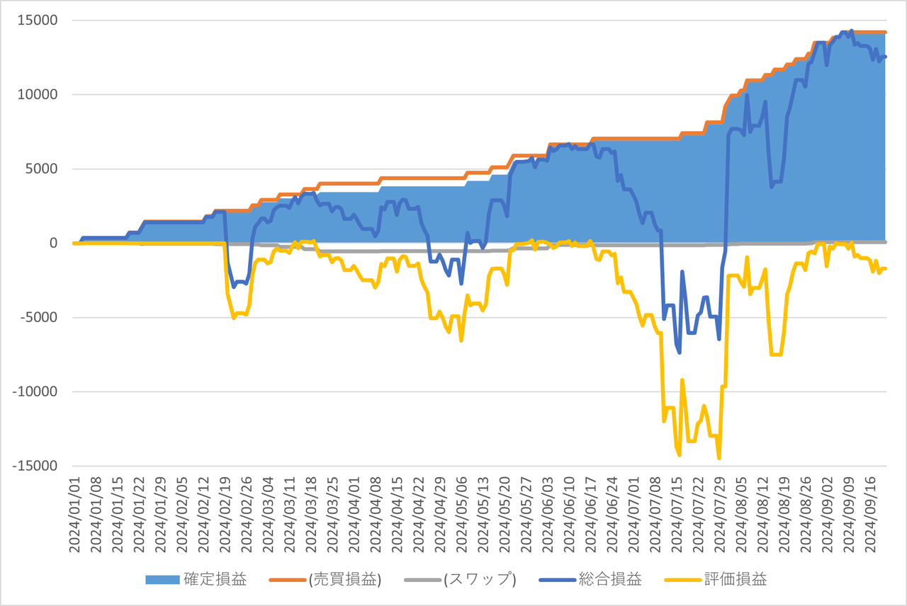 確定損益と内数としてスワップポイント、確定損益(面グラフ)に加えて評価損益(黄色ライン)と総合損益(確定損益+評価損益)(水色ライン)を表示してます。