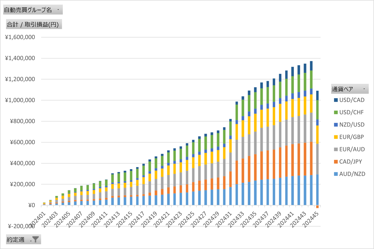 私の自動売買注文グループの注文数のバランスから、AUD/NZDが下振れ(上振れも同様)すると、評価損失(含み損)が大きくなります。今週も先週に引き続きダイナミックな値動きで、利益を積み上げてくれました。