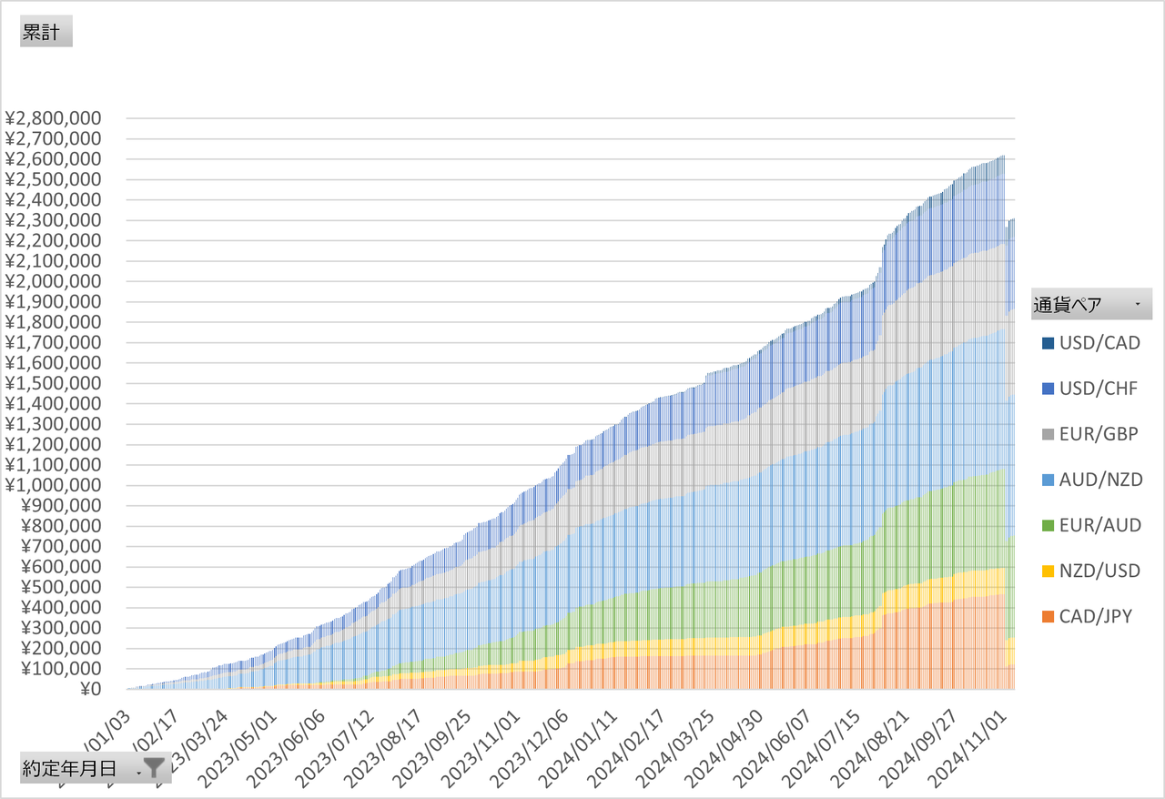 次に2023年1月からの日次で積みあがっていく利益の推移を公開します。*2023年11月に利確総額100万円を超え、2024年3月に150万円を超えました!