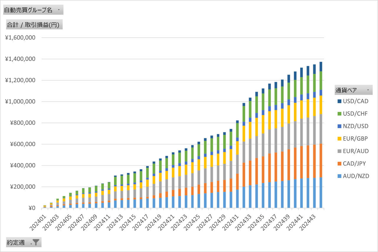 2024年の利益の推移を週次グラフで見ていきましょう約定していったログからグラフ化してますので、実際の取引状況を感じて頂けるかと思います。