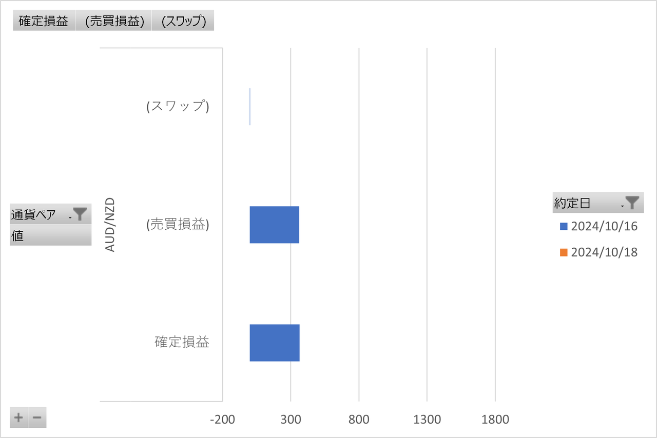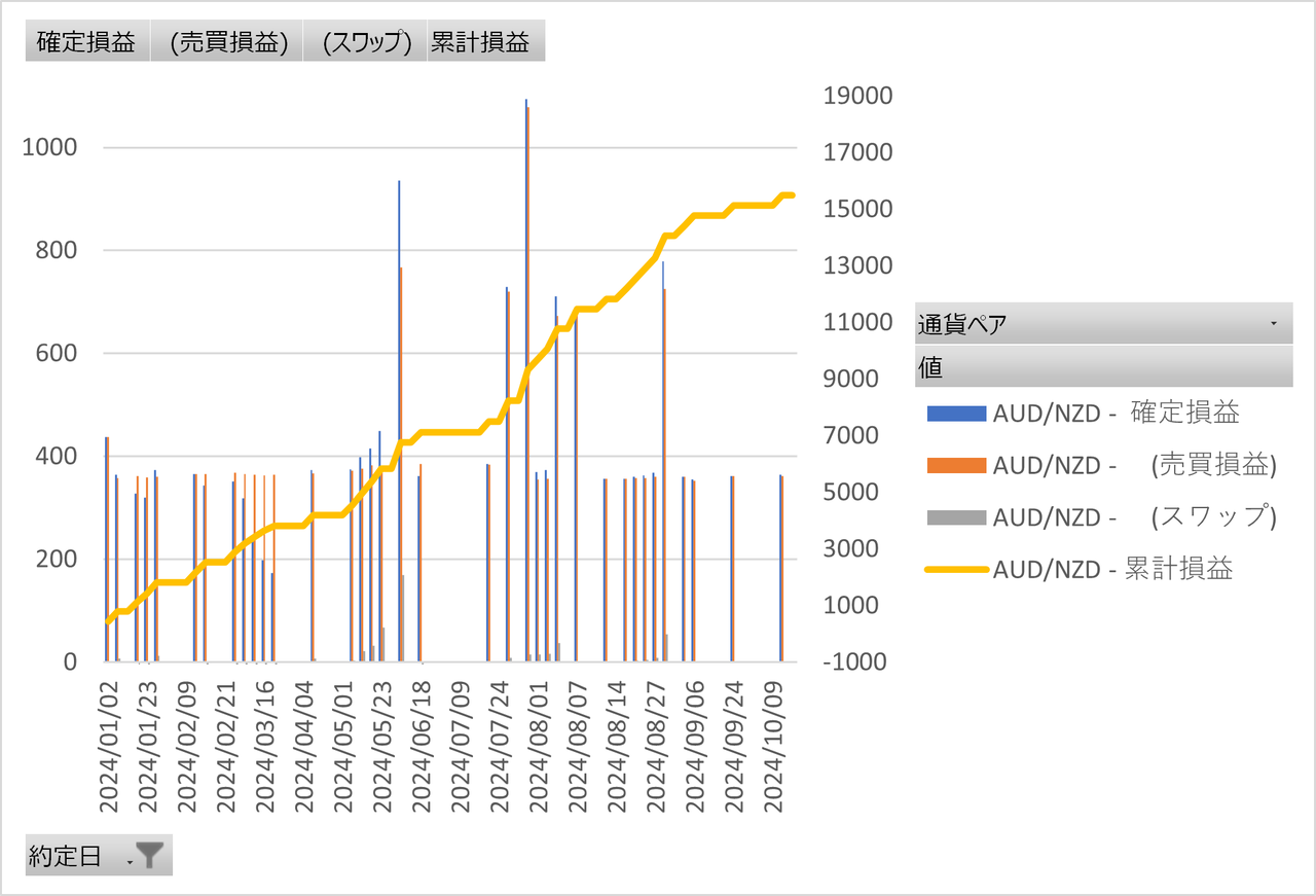 上下動を繰り返さず、上方向(豪ドル高NZドル安)に上がり続ける一方だと、評価損益だけがどんどん大きくなっていきます。