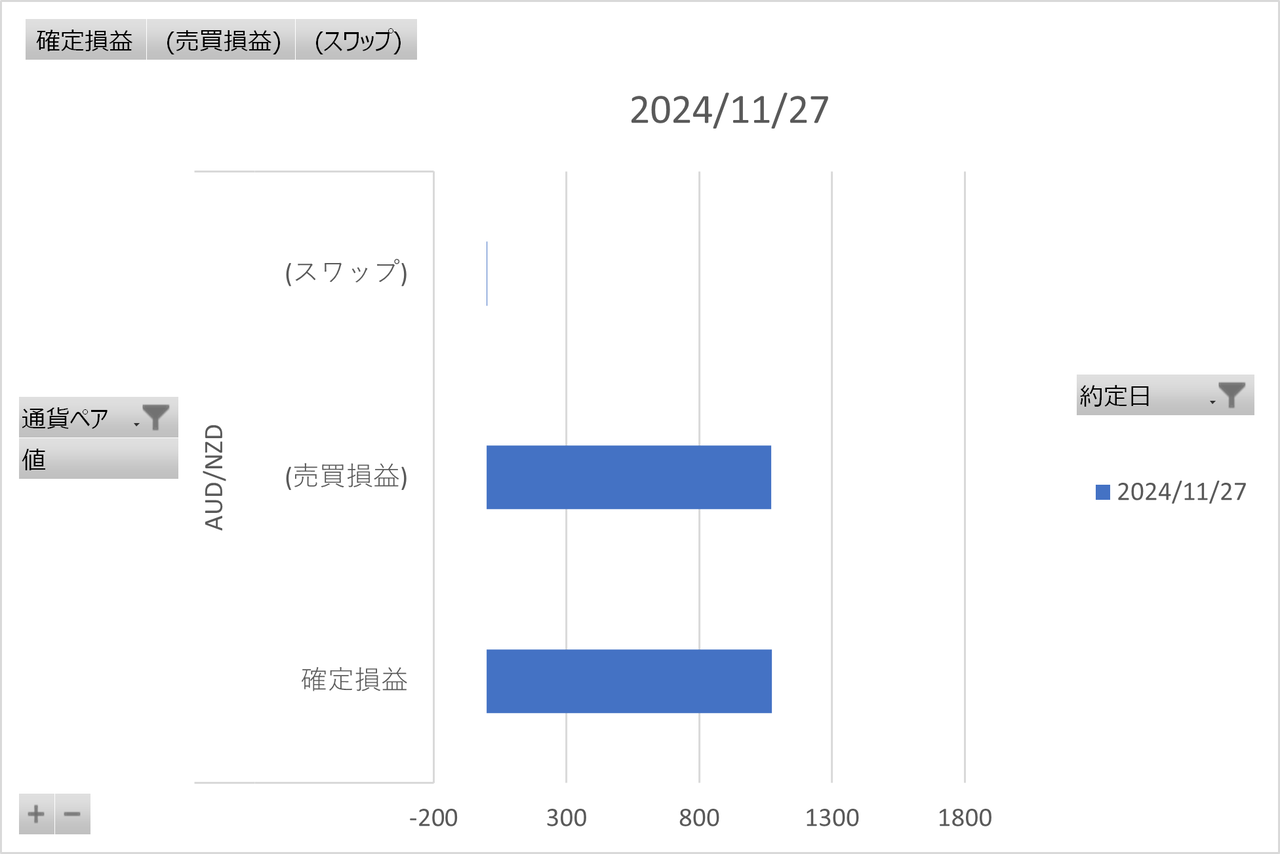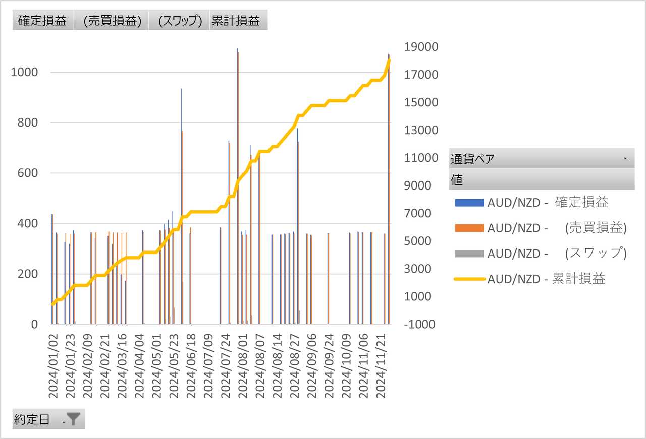 上下動を繰り返さず、上方向(豪ドル高NZドル安)に上がり続ける一方だと、評価損益だけがどんどん大きくなっていきます。