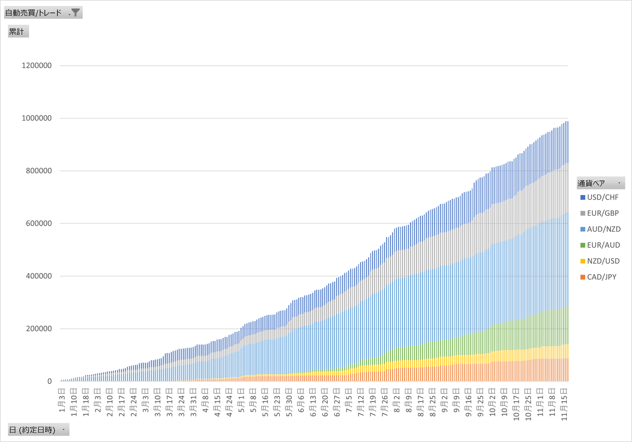 私の主力の「AUD/NZD:チャートメイク」は20pipsの狭い利確幅設定で、多くの利益を積み上げてくれました。
