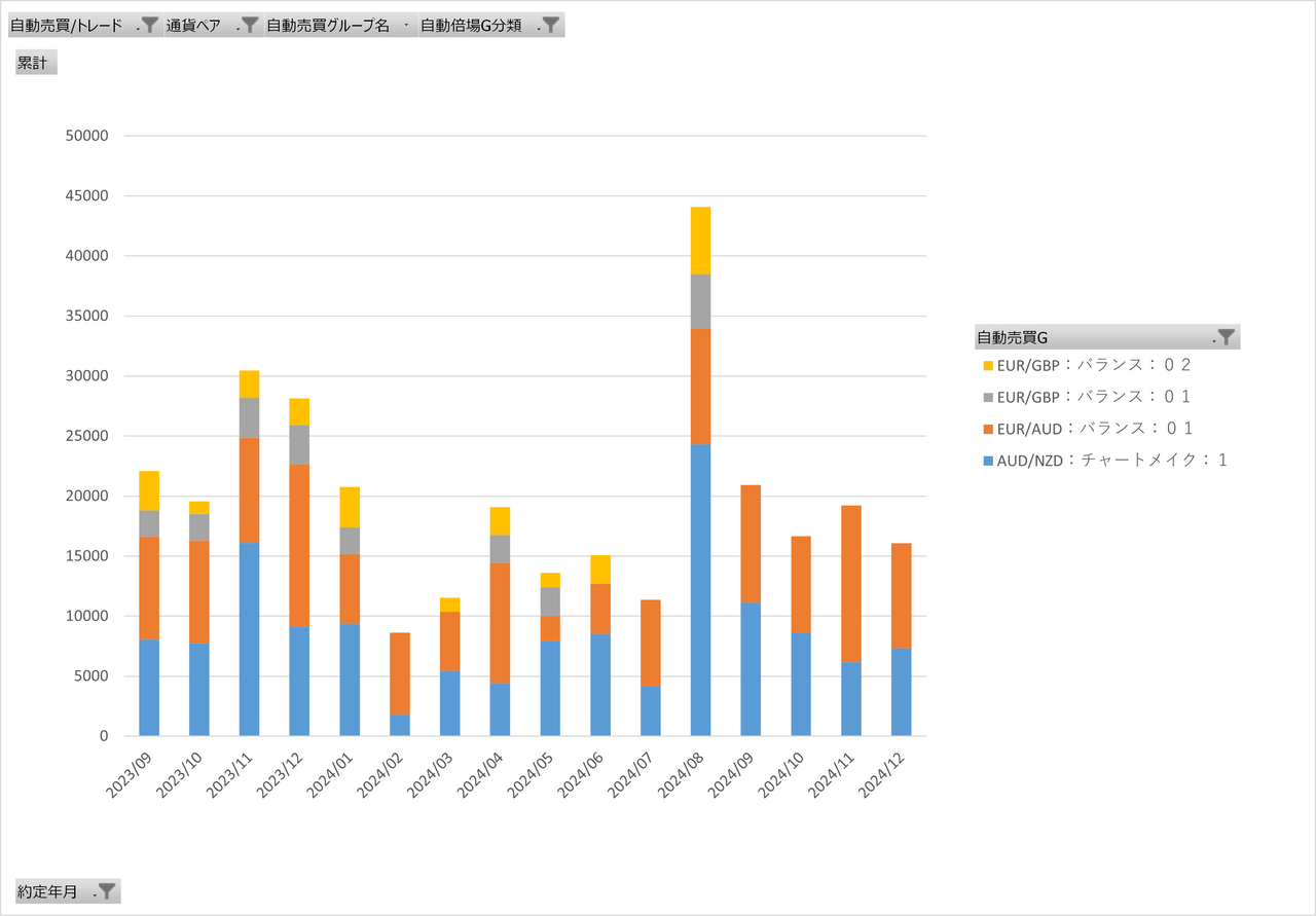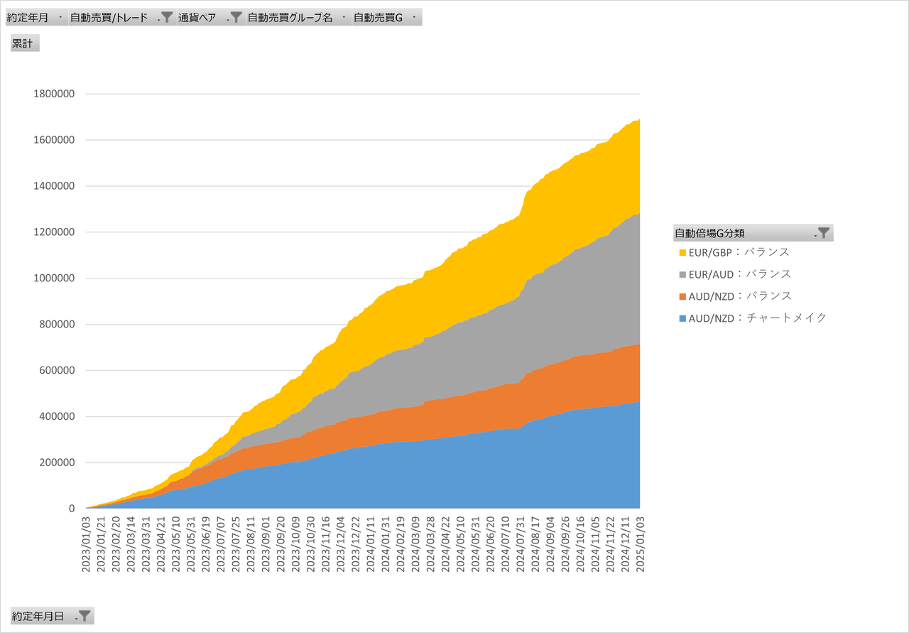 画像は2023年1月から現在までの各自動売買グループの合算の累積グラフです。