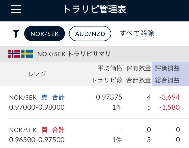 今週は、AUD/NZDは注文なし、NOK/SEKで新規売り注文がありました。