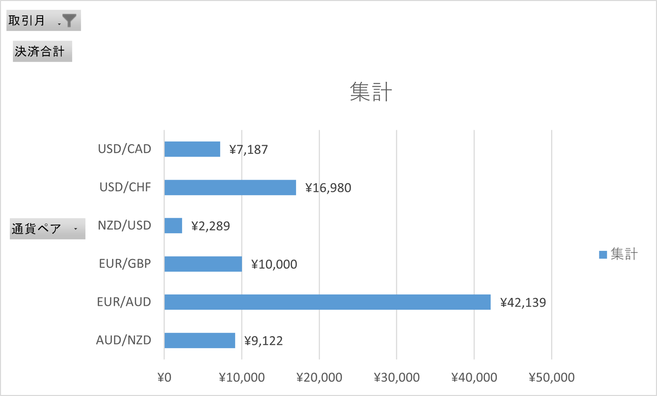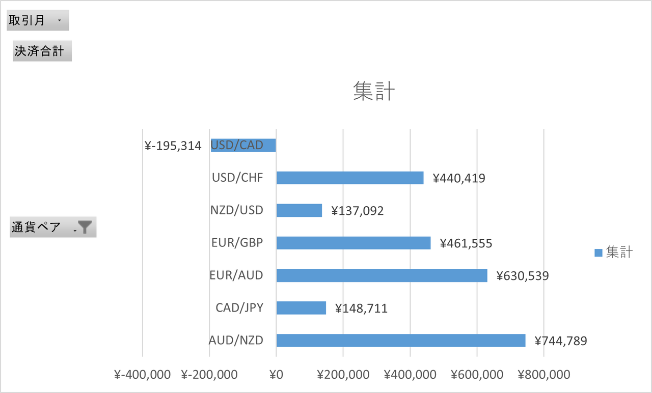 一方、これまで月に40回以上も利確を続けていたAUD/NZDが月を通じてボラティリティが低く、注文が少なく、利確額が伸びない主原因となりました。
