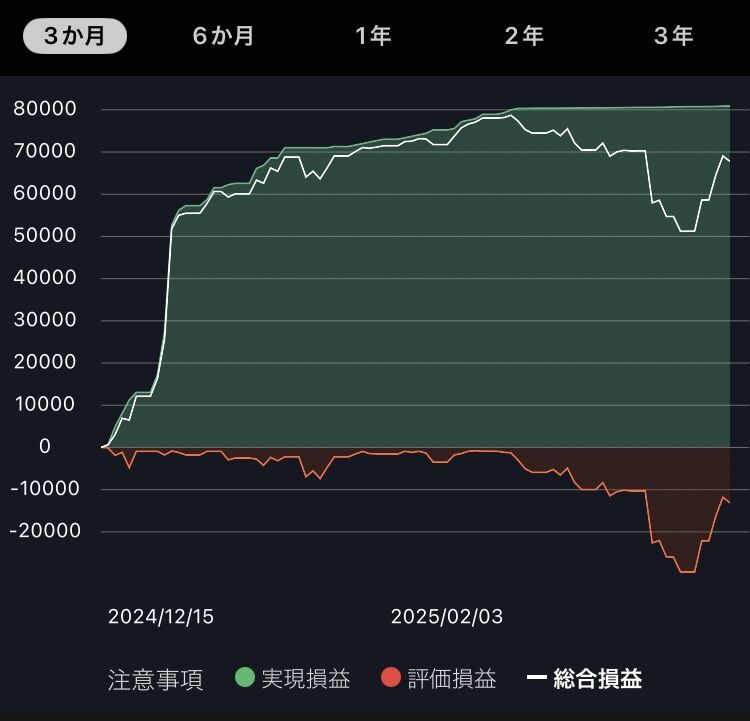 3カ月にしても1年にしても損失のピークは直近の数週間であることがわかると思いますが、マイナス3万円ほどです。