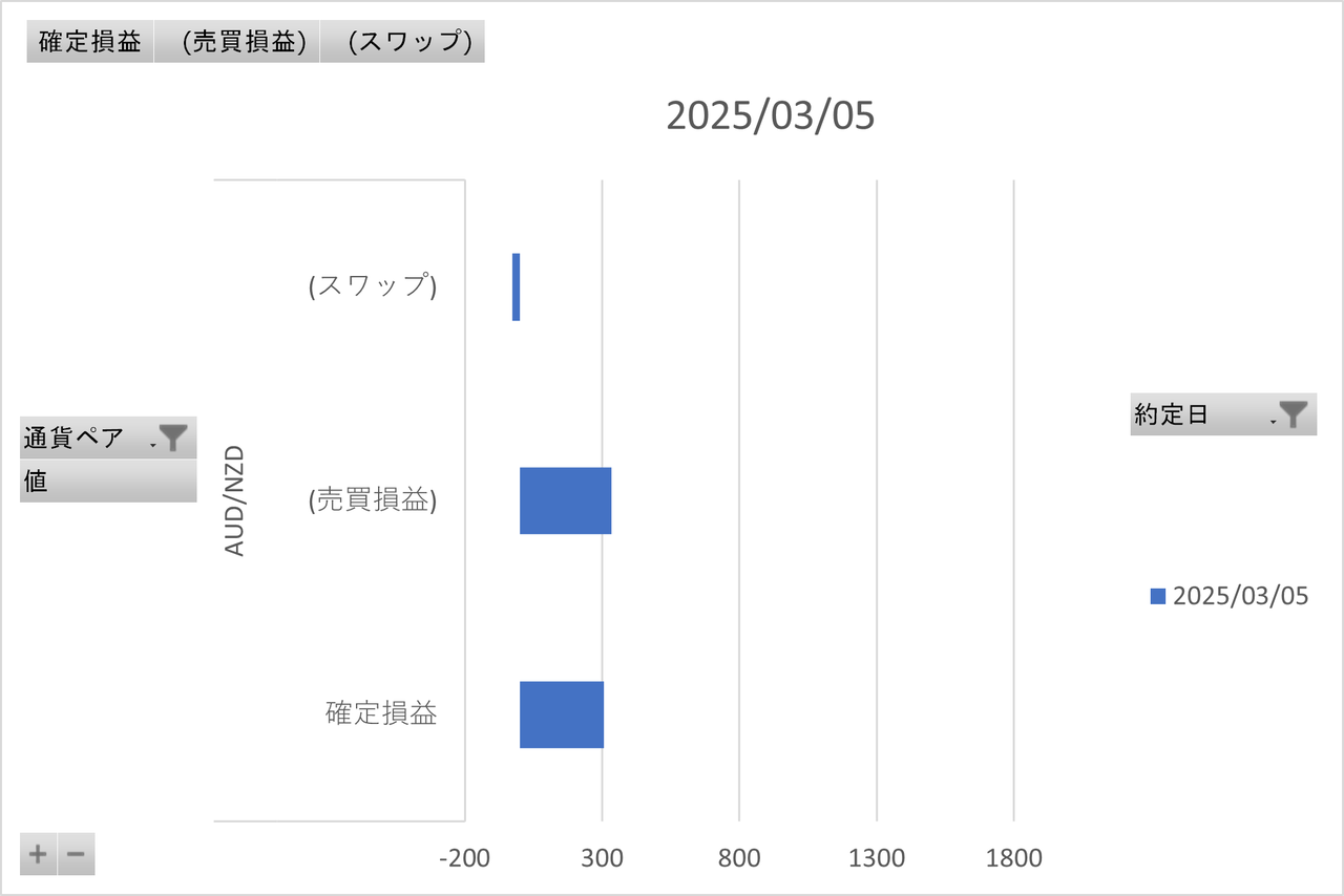 上下動を繰り返さず、上方向(豪ドル高NZドル安)に上がり続ける一方だと、評価損益だけがどんどん大きくなっていきます。