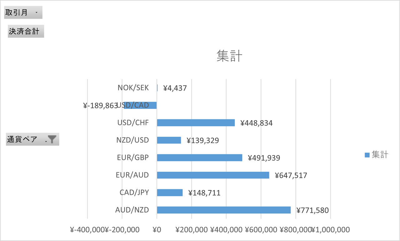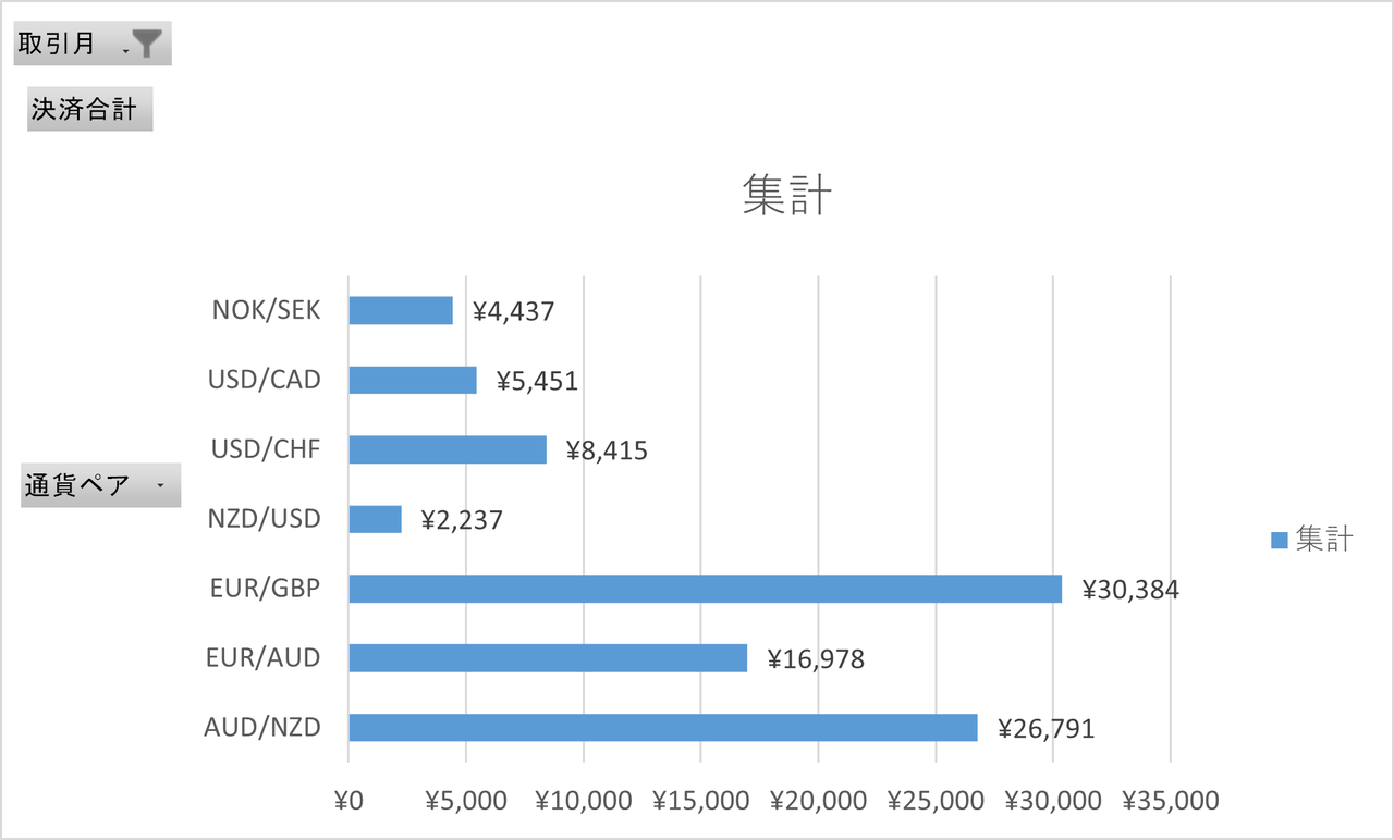 EUR/AUDが60万円を超え、EUR/GBP、USD/CHFが40万円で続いています。