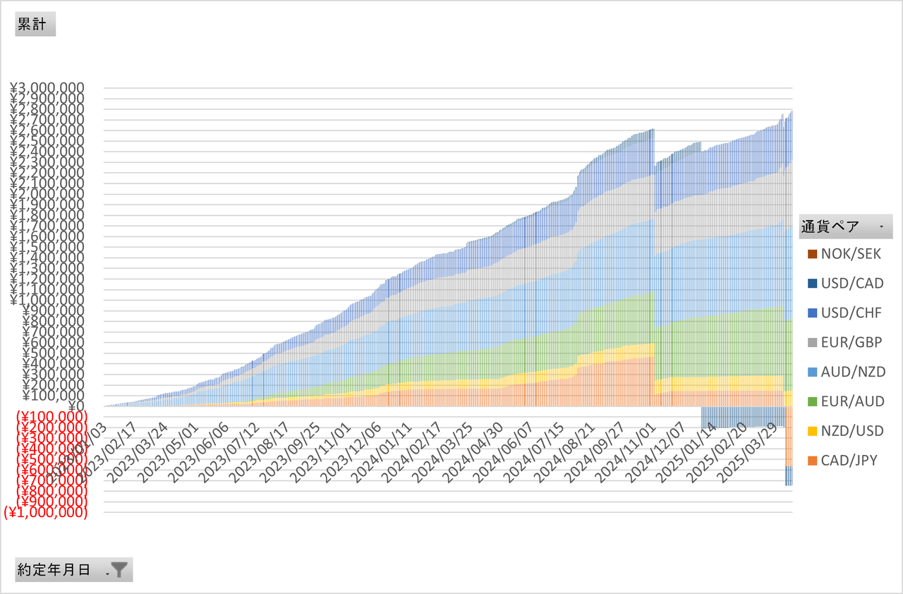 次に2023年1月からの日次で積みあがっていく利益の推移を公開します。*2023年11月に利確総額100万円を超え、さらに2024年7月についに200万円を超えました!