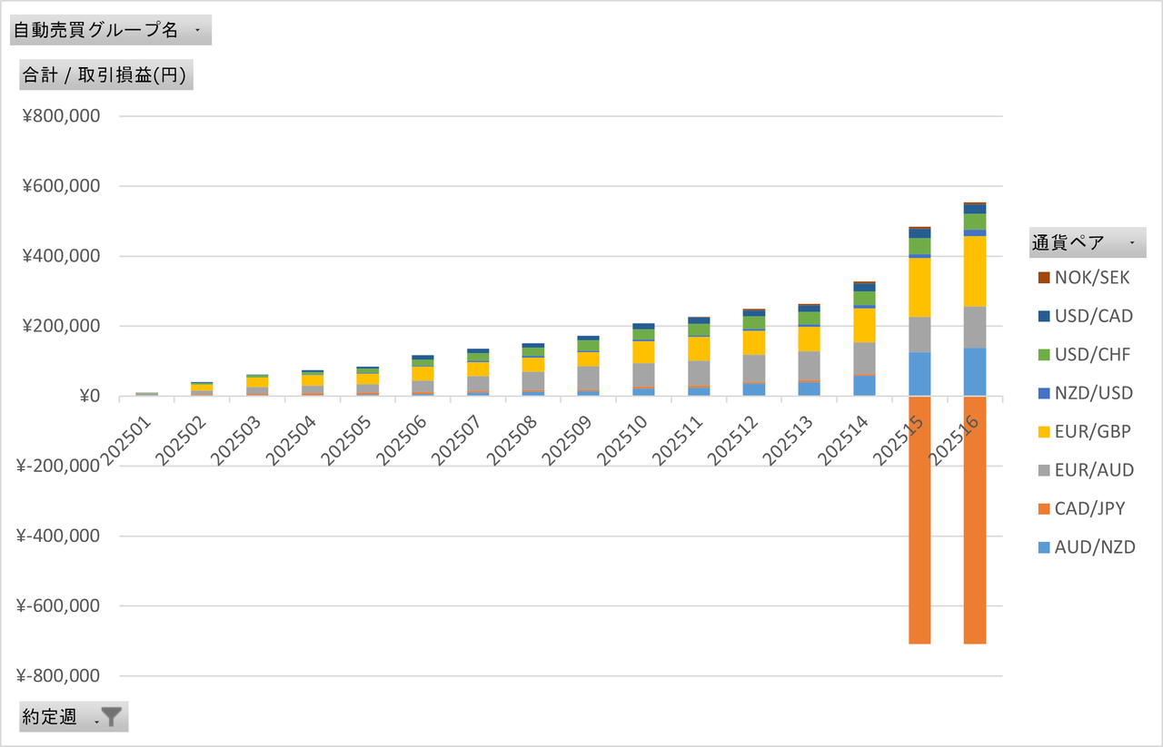 2025年の利益の推移を週次グラフで見ていきましょう約定していったログからグラフ化してますので、実際の取引状況を感じて頂けるかと思います。