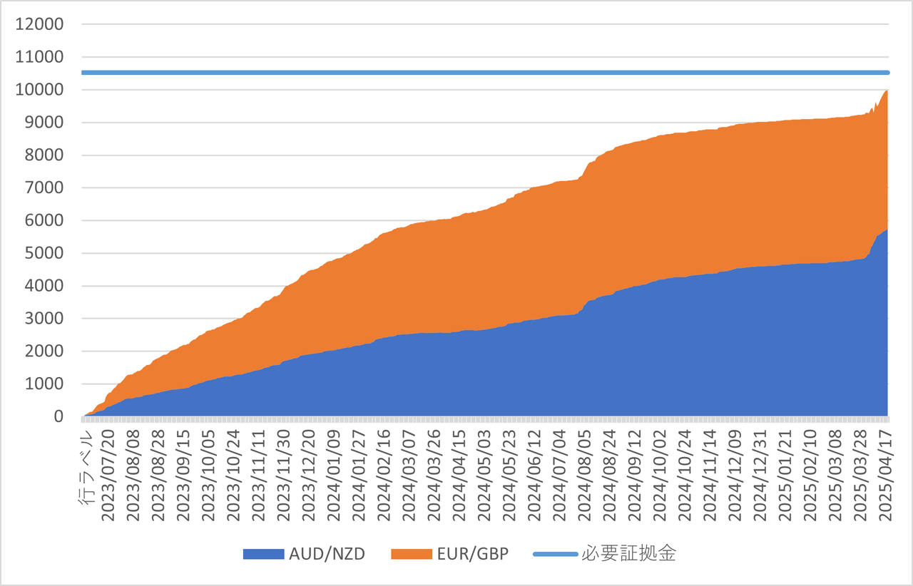 下の図は10,520円を必要証拠金として青ラインを引いて、積み上げグラフで証拠金に対しての利確額をイメージください。