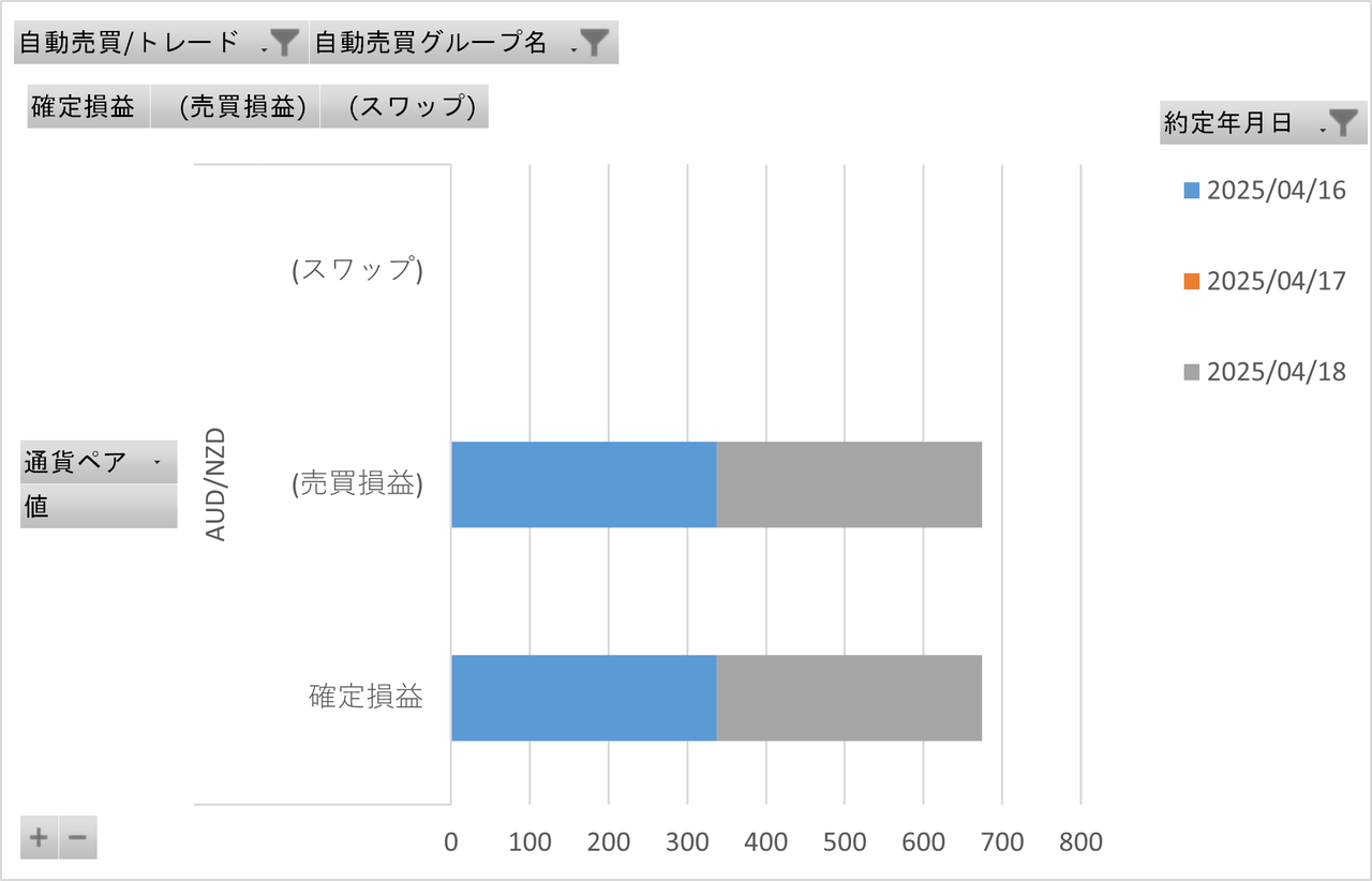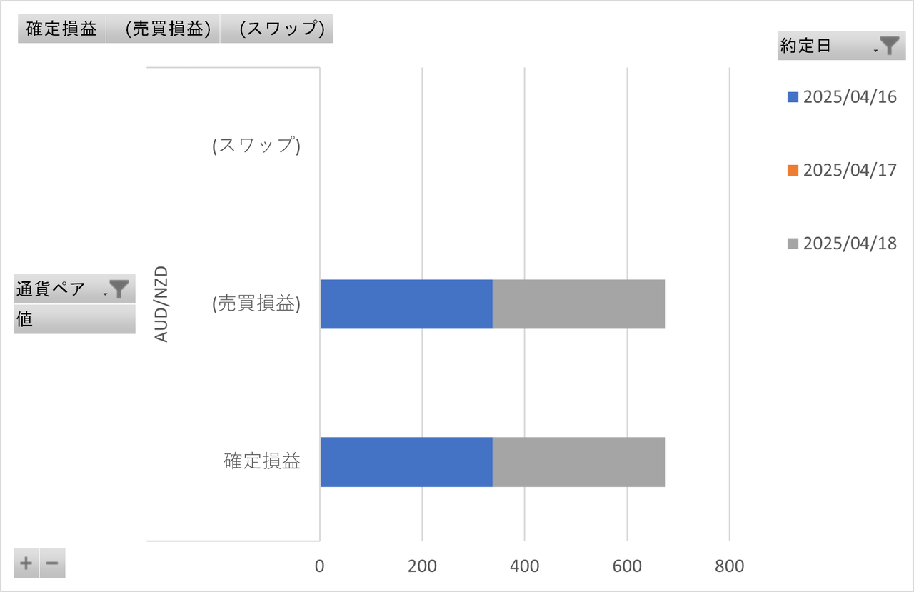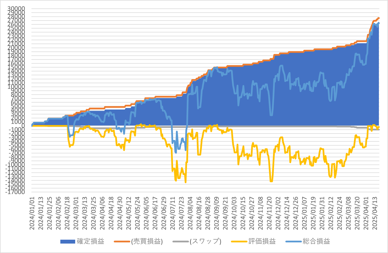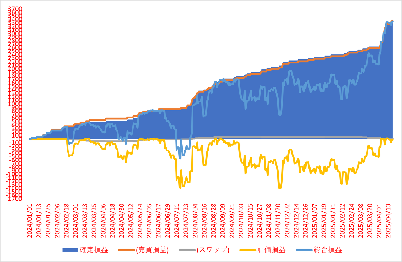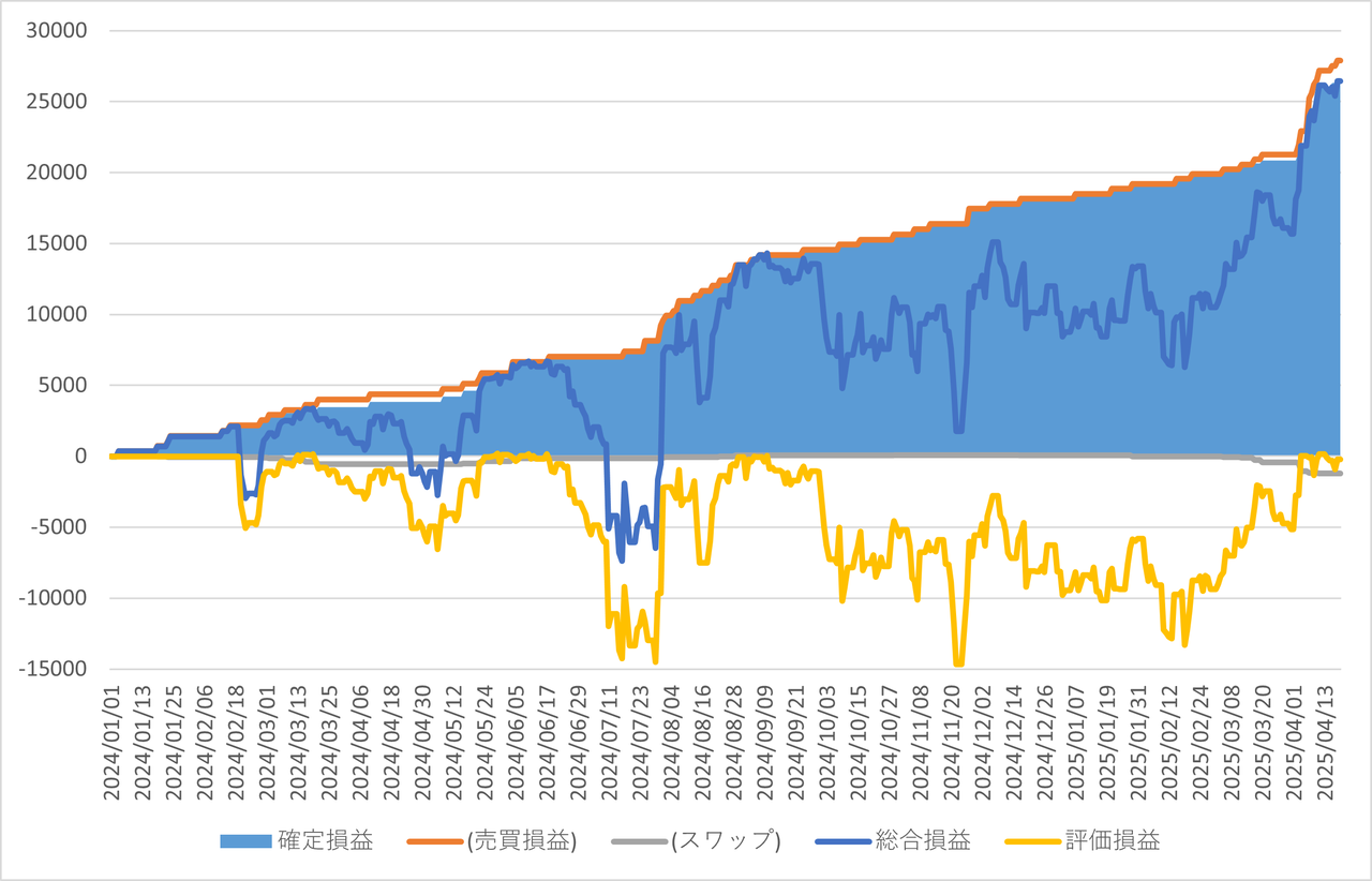 確定損益と内数としてスワップポイント、確定損益(面グラフ)に加えて評価損益(黄色ライン)と総合損益(確定損益+評価損益)(水色ライン)を表示してます。