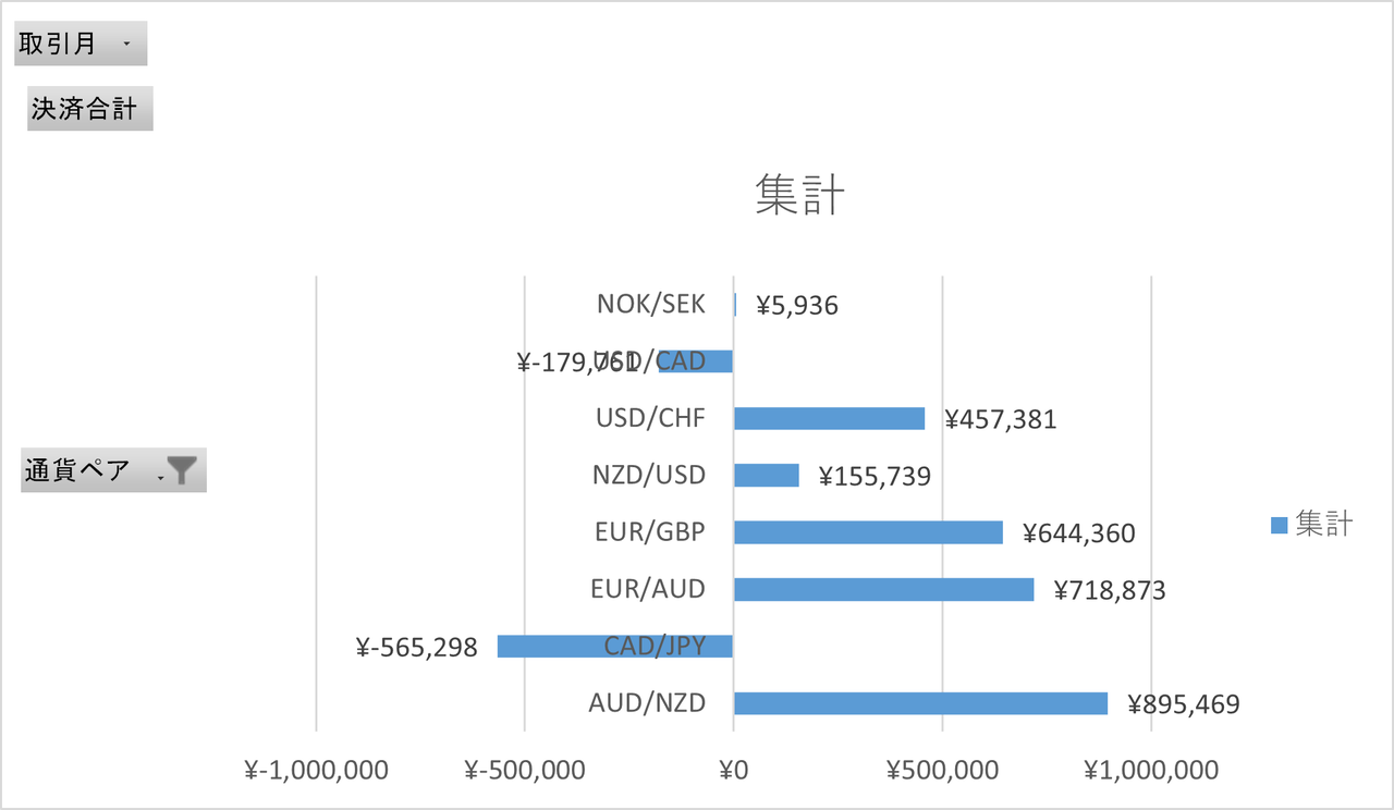 EUR/AUDが70万円、EUR/GBPが60万円を超え、USD/CHFが40万円で続いています。