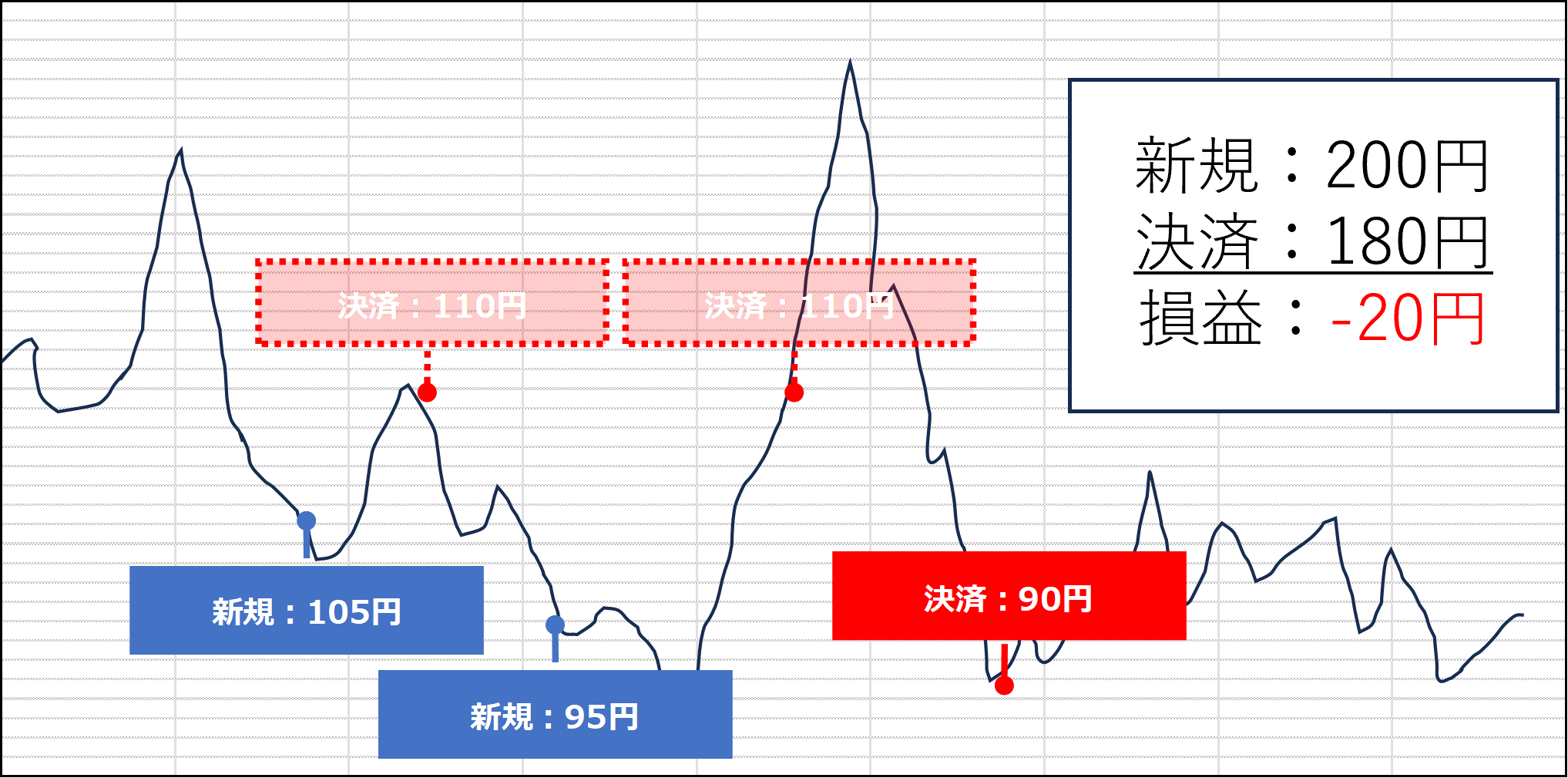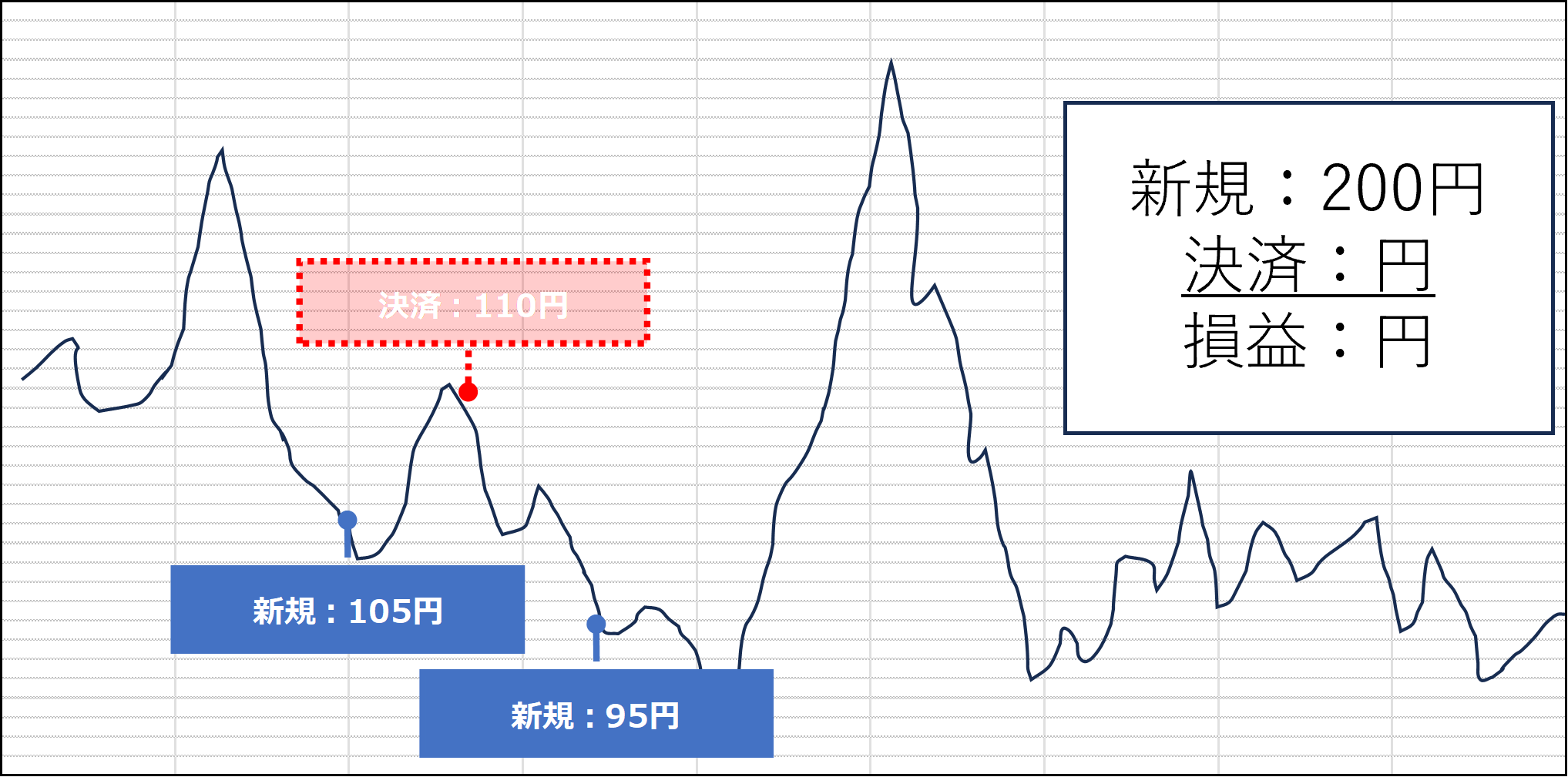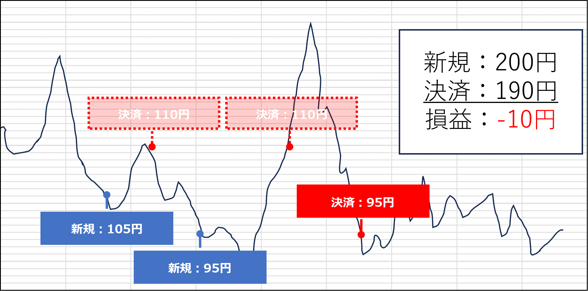 ついに95円まで下げてしまったタイミングで決済した場合ですが、難平をして平均取得価額を200円とした場合は、損益は-10円となります(95×2-105+95=190-200=-10)。