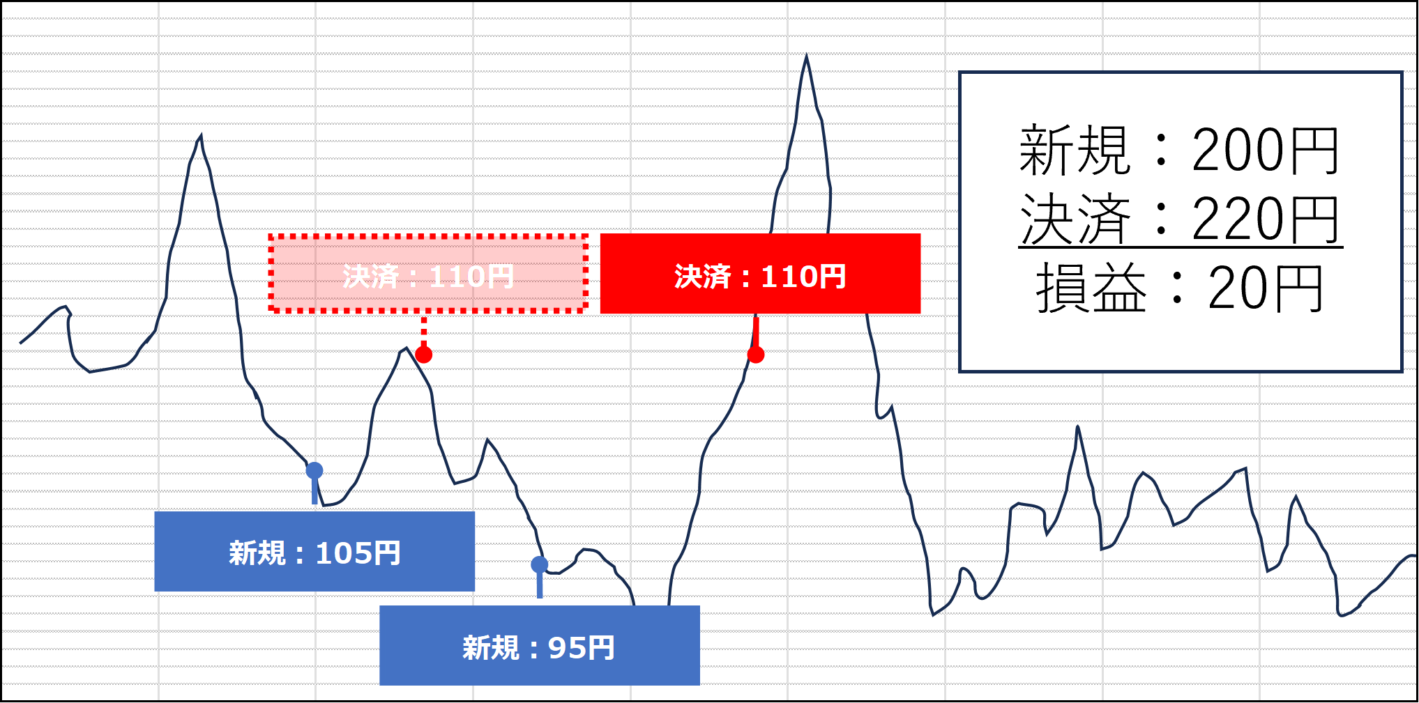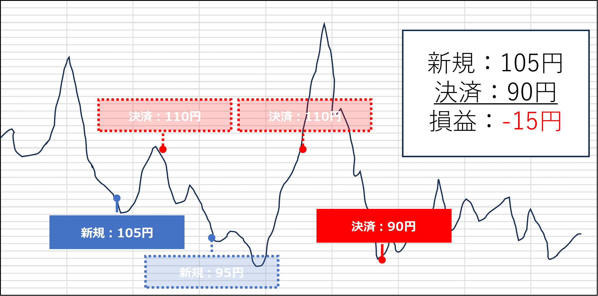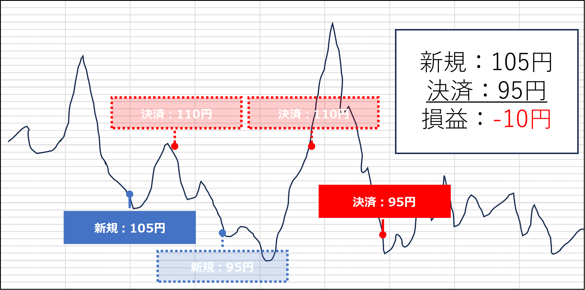 105円で新規に買いポジションを持ち、その後110円で決済したとすると、損益は+5円です。
